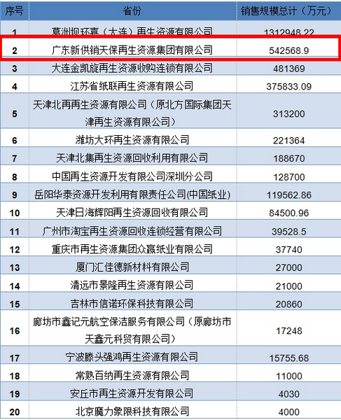 广东新供销天保再生资源集团有限公司坚持以国家生态文明改革建设总体要求和供销合作社综合改革精神为指导,创新废纸回收加工利用商业模式,把准市场脉搏,积极构建废纸回收利用网络,大力拓展废纸销售渠道,实现了废纸回收利用量与销售额的重大突破,名列中国回收纸行业排行榜第二位。
