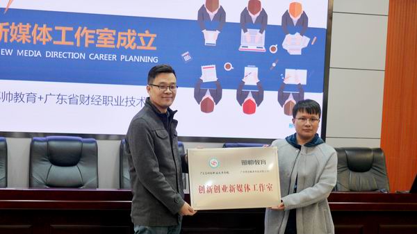 2018年12月13日下午,省财经学校艺术设计系与广州邢帅教育科技有限公司在实训楼二楼多媒体会议室举行了创新创业新媒体训练营结营暨创新创业新媒体工作室挂牌仪式。艺术设计系主任刘映春、副主任李丞、广州邢帅教育科技有限公司代表及训练营学生共30人参加了仪式。